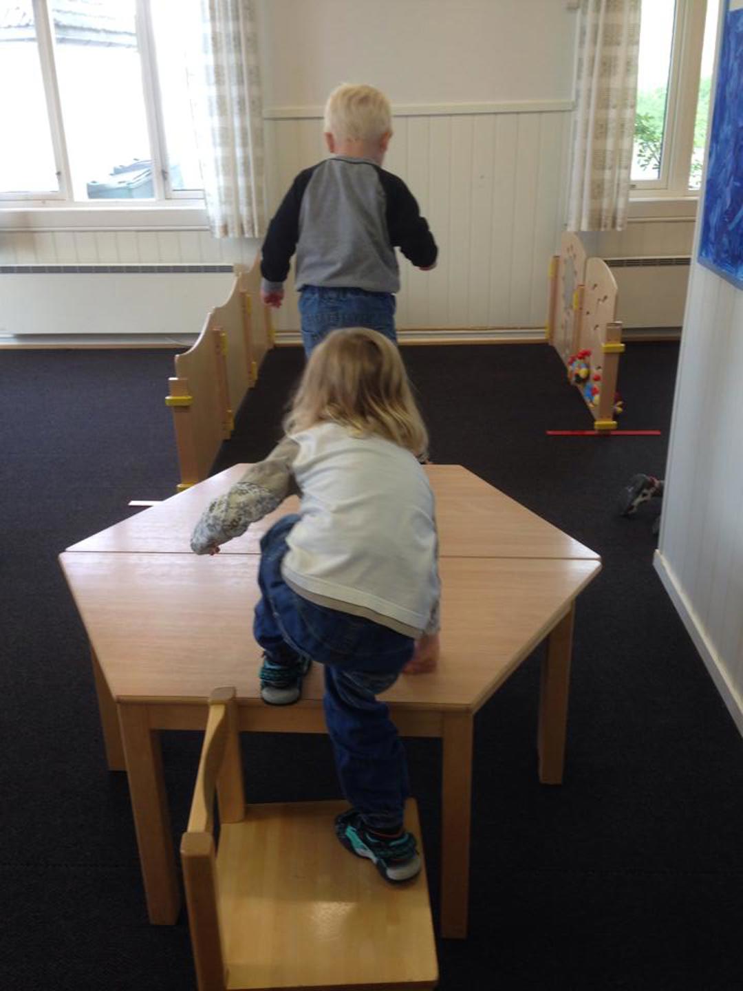 Vi lager hinderløype med bord og stoler, barna skal gå over og krabbe under.